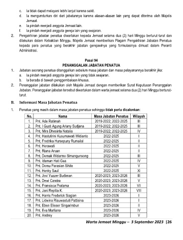 2. Pengakhiran jabatan penatua diwartakan kepada Jemaat selama dua (2) hari Minggu berturut-turut dan